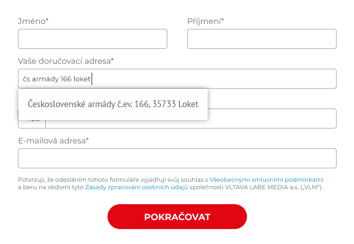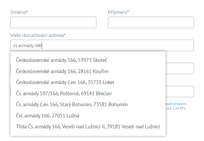 Při zadávání je potřeba vypisovat adresu nejlépe v pořadí město, ulice, číslo … Čím více údajů napíšete tím přesnější bude nabídnutý výběr. Adresy se při vypisování budou postupně až na finální adresu, která je právě ta vaše. Správnou adresu je potřeba zvolit kliknutím, aby se vyplnila z výběru a přesně tak, jak je registrována. Bez výběru správné adresy není možné pokračovat, protože náš systém nabízí adresy z registru adres a není možné použít jinou variantu.